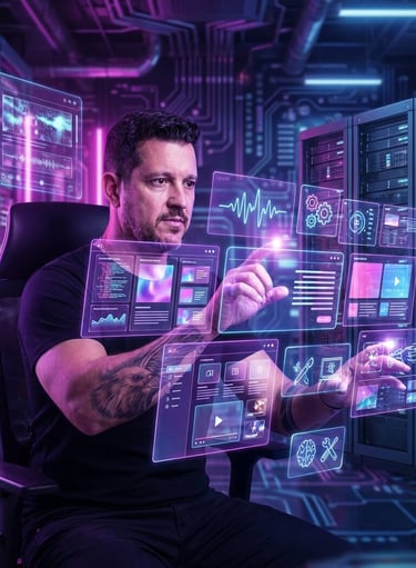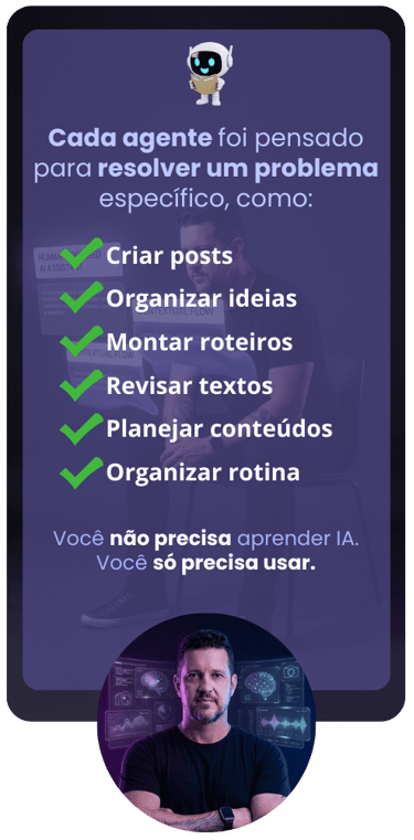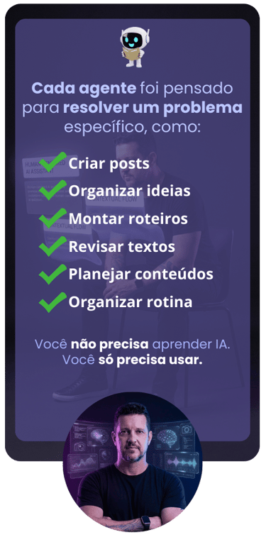 São 5 agentes prontos, que você abre, escreve o que precisa e recebe respostas claras, organizadas e utilizáveis.
