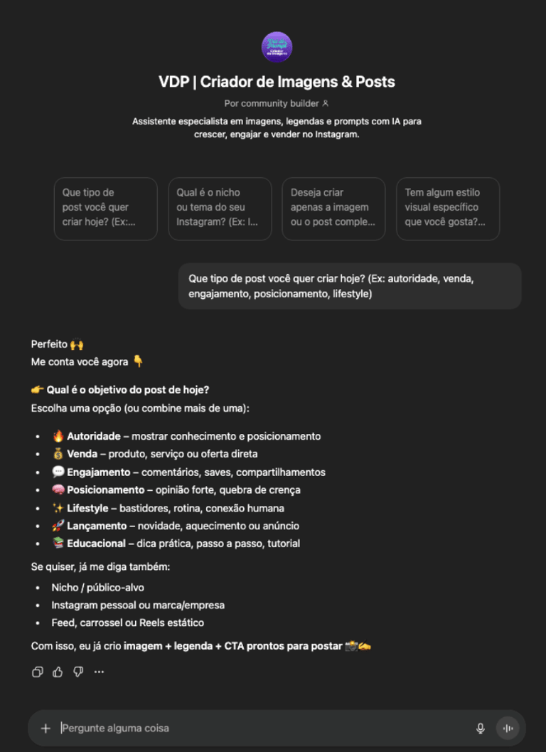 O que faz: Cria ideias de imagens, prompts visuais, legendas e chamadas para ação prontas para postar.